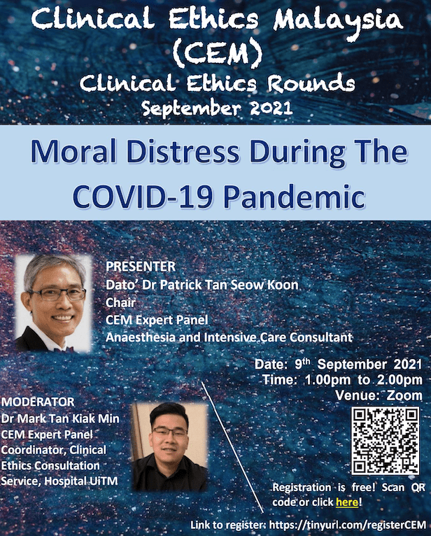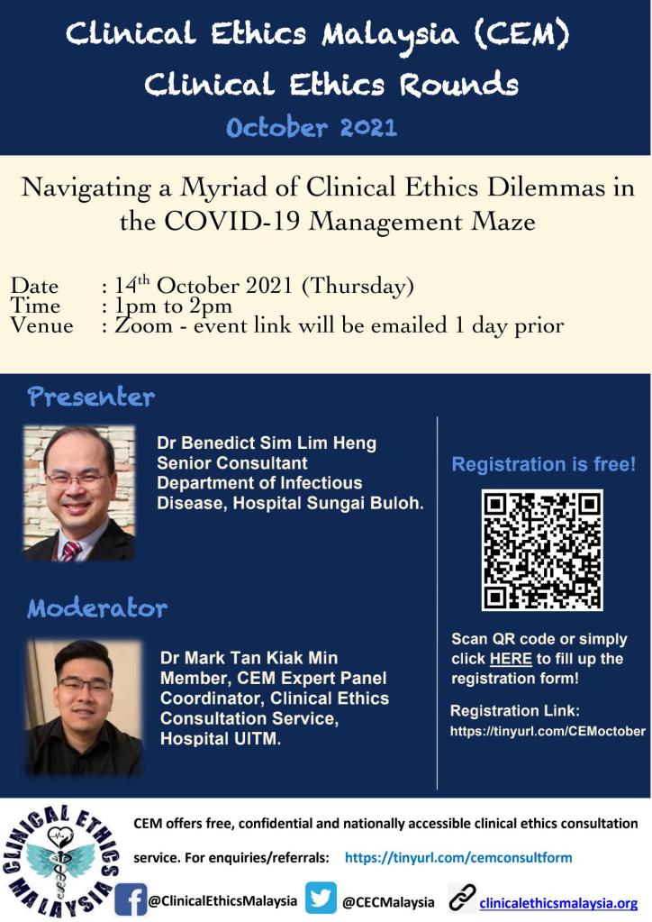 The COVID-19 pandemic has brought a myriad ethical challenges to the forefront of healthcare. These include public health ethics, dilemmas in the clinical management of COVID-19 patients and considerations related to COVID-19 vaccinations. We welcomed Dr Benedict Sim Lim Heng, Infectious Disease Senior Consultant, Hospital Sungai Buloh as our presenter. This hour-long session focused on the ethical dilemmas encountered in the daily care of COVID-19 patients in Malaysia, especially during the recent surge in patients requiring hospital admission and intensive care.