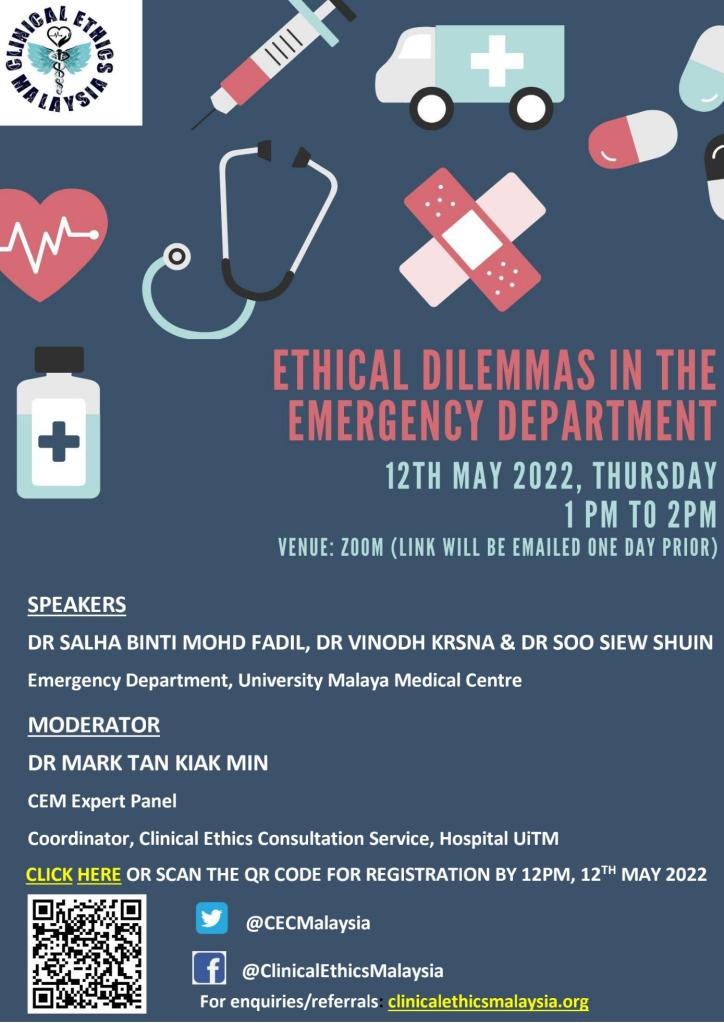 We discussed clinical ethics dilemmas on resource allocation and at-own-risk discharge in the Emergency Department – with emphasis on how ethical principles of autonomy, non-maleficence and beneficence intersect in daily clinical work. Clinical cases were contributed by registrars from the Emergency Department, University Malaya Medical Centre (UMMC) and the event was moderated by Dr Mark Tan.