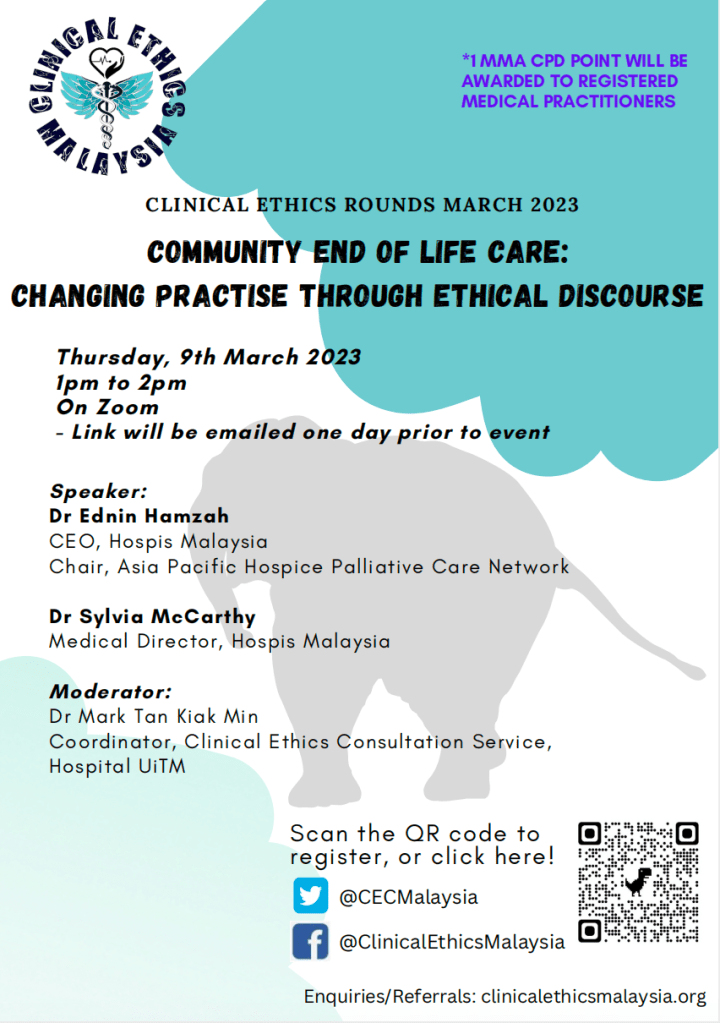 We were privileged to have Dr Ednin Hamzah and Dr Sylvia McCarthy from Hospis Malaysia to share with us significant ethical issues that are often overlooked in palliative care which may often result in poor clinical decision making and great distress. The event was moderated Dr Mark Tan Kiak Min.