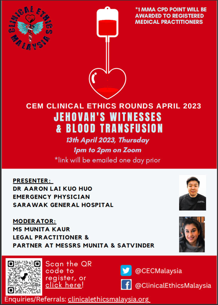 Dr. Aaron Lai, an Emergency Physician at Sarawak General Hospital presented a compelling case that highlights an ethical dilemma encountered when managing a Jehovah’s Witness patient who requires a surgery and blood transfusion. The discussion also covered the complexities surrounding Jehovah’s Witnesses advanced care directives. The event was moderated by Ms Munita Kaur.